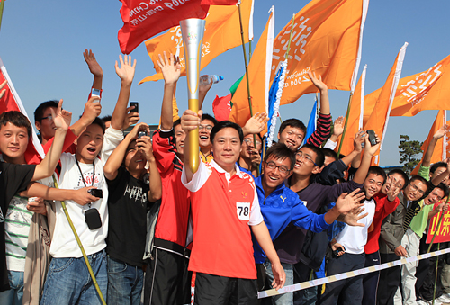 丁杰董事長作為全運(yùn)會火炬日照傳遞活動的第七十八棒火炬手,參加了萬平口海濱生態(tài)廣場段的后三棒火炬?zhèn)鬟f。在等候火炬?zhèn)鬟f的空隙,他接受了日照電視臺記者的采訪。他說,第十一屆全運(yùn)會火炬?zhèn)鬟f活動在我市舉行,將進(jìn)一步促進(jìn)“和諧中國,全民全運(yùn)”理念的傳播與普及,進(jìn)一步激發(fā)全市人民關(guān)心、 支持、參與和奉獻(xiàn)全運(yùn)會的熱情。他表示,作為一名民營企業(yè)家代表能成為全運(yùn)會的一名火炬手,他感到十分光榮和自豪,表示要把全運(yùn)會的精神帶到企業(yè)中去,推動企業(yè)更好更快發(fā)展,為日照經(jīng)濟(jì)和社會各項(xiàng)事業(yè)的發(fā)展貢獻(xiàn)力量。采訪結(jié)束后,圍觀的群眾紛紛要求同丁杰董事長合影留念,他都欣然接受。10時左右,在現(xiàn)場觀眾的熱烈掌聲和歡呼聲中,丁杰董事長從上一棒火炬引燃了自己手中的“如意”火炬,高高舉在頭頂向圍觀人群示意,開始了神圣的火炬?zhèn)鬟f……